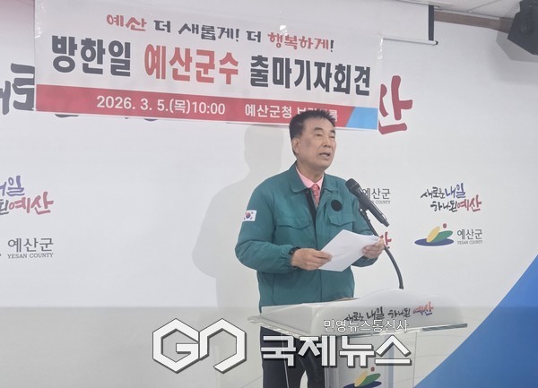 (예산=국제뉴스) 박의규 기자 = 방한일 충남도의원(예산1·국민의힘)이 5일 기자회견을 열고 "예산을 더 새롭게, 군민을 더 행복하게 만들겠다"며 민선 9기 예산군수 출마를 공식 선언했다.
