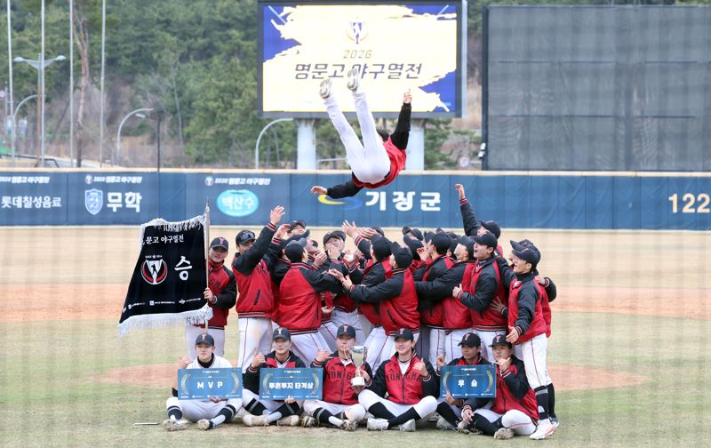 5일 부산 기장현대차드림볼파크에서 열린 2026 명문고야구열전 결승전에서 용마고가 우승을 차지했다. 마산용마고 선수들이 진민수 감독을 헹가래 치고 있다. 사진=박범준 기자