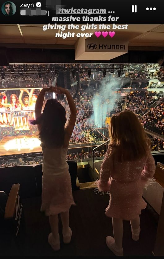 5일(현지시간) 제인 말리크는 자신의 SNS 스토리 기능을 통해 트와이스의 콘서트를 관람 중인 사진 한 장을 게재했다. 공개된 사진 속에는 핑크색 반짝이 의상을 맞춰 입은 두 아이가 무대를 바라보며 열광하는 뒷모습이 담겼다.