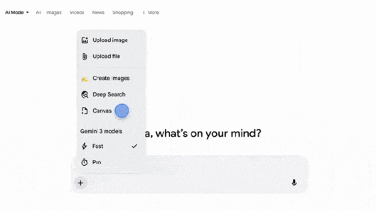 AI 모드에서 툴 메뉴(+)를 클릭해 캔버스를 선택한 뒤 만들고 싶은 내용을 설명하면, 화면 측면에 캔버스 패널이 열리며 웹 정보와 구글 지식 그래프 데이터를 결합해 작업할 수 있다. 프로토타입이나 앱을 제작하는 경우 기능을 직접 테스트하고, 기본 코드 확인 및 수정도 가능하다. 이 과정에서 제미나이와 대화하며 기능을 세부 조정할 수 있다.