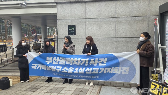 서울중앙지법 동관 앞에서 13일 변호인단이 부산돌려차기 기자회견을 하고있다. |