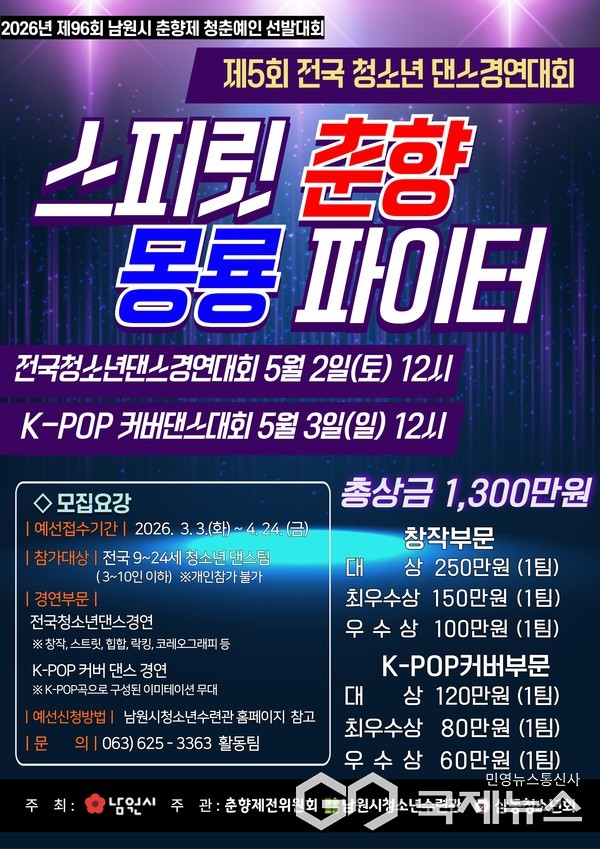 참가 신청은 오는 4월24일까지며 참가를 희망하는 팀은 남원시청 또는 남원청소년수련관 홈페이지에서 신청 양식을 내려받아 작성한 후 댄스 영상과 함께 이메일로 제출하면 된다.