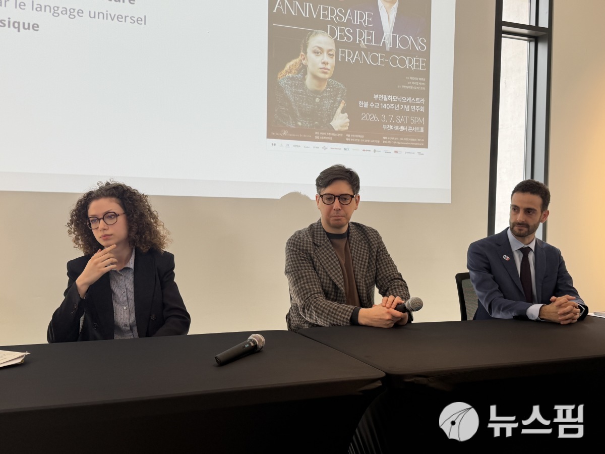 [서울=뉴스핌] 김용석 선임기자 = 5일 서울 서대문구 주한 프랑스대사관에서 '한불 수교 140주년 기념 개막 음악회' 기자간담회에서 (맨 왼쪽부터) 피아니스트 아리엘 벡과 지휘자 아드리앙 페뤼숑, 모르코스 주한 프랑스대사관 문화참사관. 2026.03.05 fineview@newspim.com |