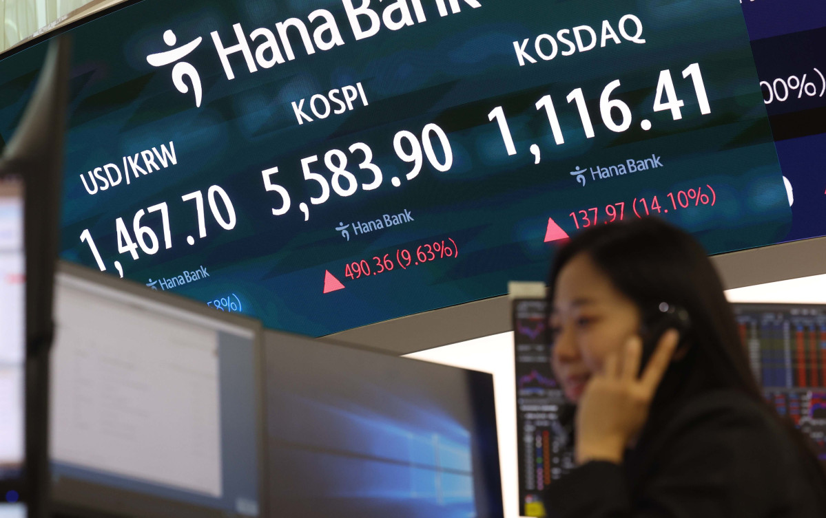 최근 연이틀 폭락한 코스피가 역대 최대 상승폭을 기록하며 급반등, 단숨에 5580대를 회복한 5일 서울 중구 하나은행 딜링룸에 코스피 등 시황이 표시되고 있다. 이날 코스피는 전 거래일보다 490.36포인트(9.63%) 오른 5583.90에 장을 마쳤다. 코스닥도 전장보다 137.97포인트(14.10%) 급등한 1116.41에 거래를 마무리했다. 서울 외환시장에서 원·달러 환율은 전 거래일보다 8.1원 내린 1468.1원에 마감했다. 신태현 기자 holjjak@ |