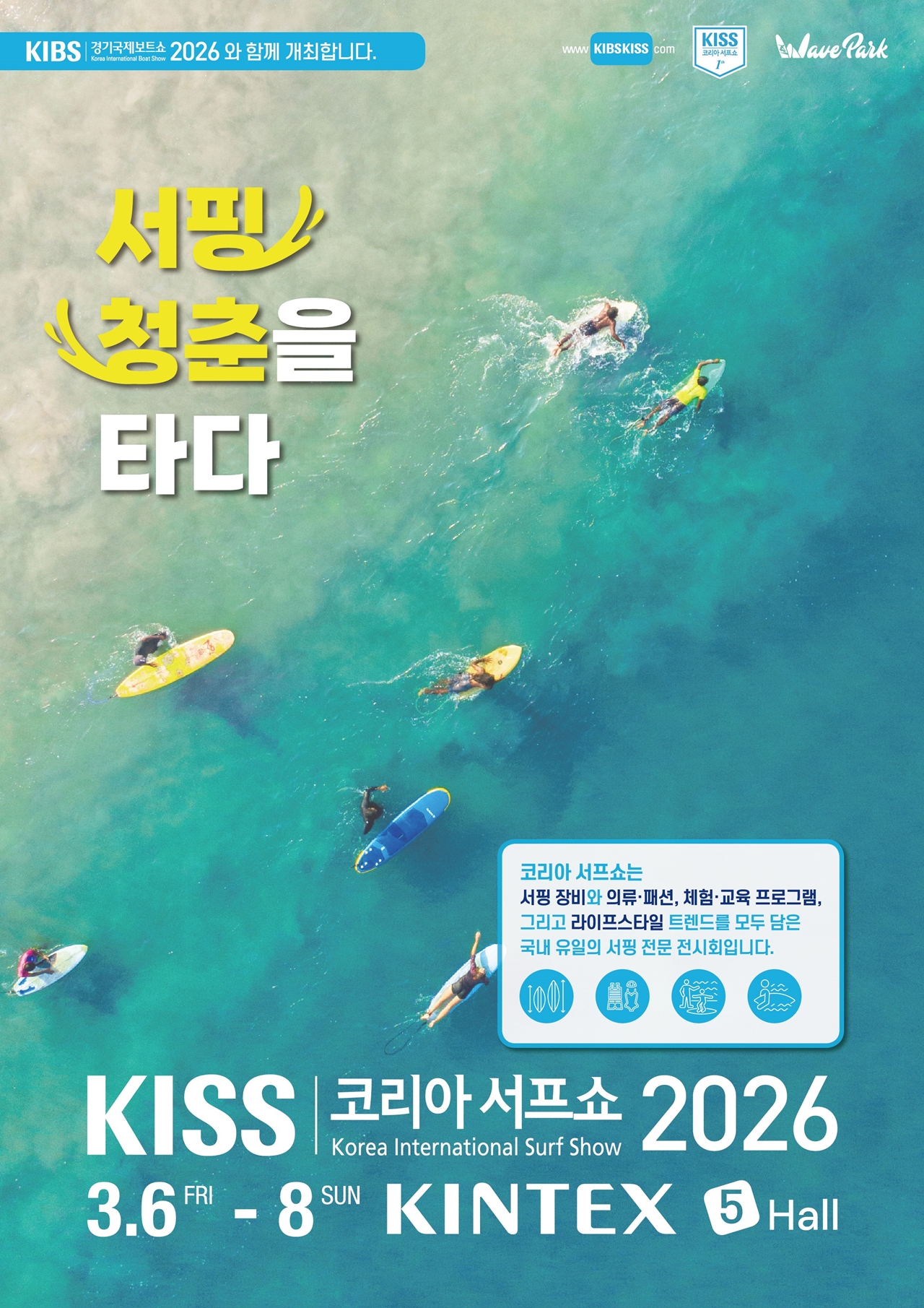 코리아서프쇼는 시흥 웨이브파크와 공동주관으로 운영되며, 서핑 장비, 의류, 액세서리, 교육 프로그램 등 서핑 산업 전반을 소개하는 전문 전시관으로 구성된다.