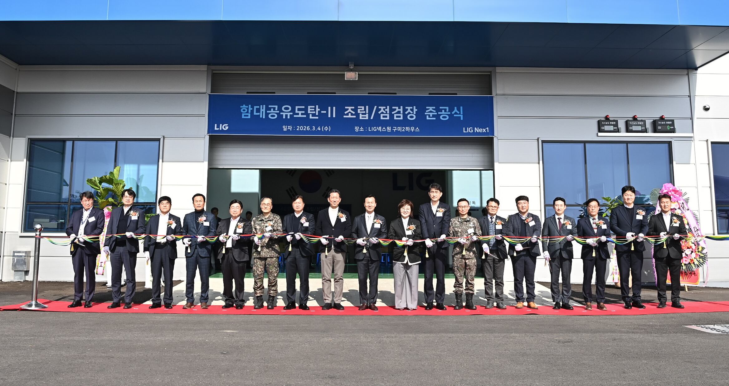 지난 4일 경북 구미시 구미2하우스에서 열린 LIG넥스원 함대공유도탄-Ⅱ 조립·점검장 준공식에서 참석자들이 기념 촬영하고 있다. /구미시 |