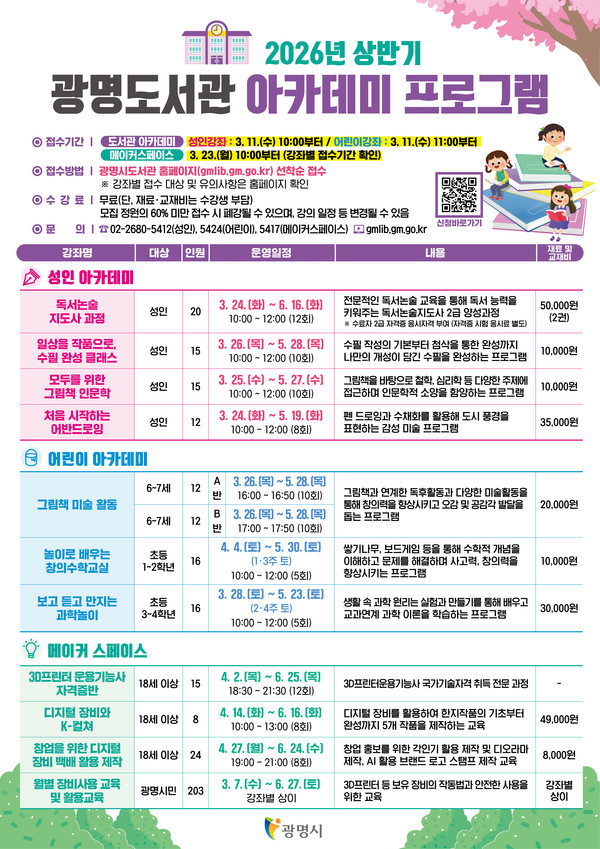 (광명=국제뉴스) 윤은중 기자 = 광명도서관은 시민의 평생학습 기회 확대와 독서문화 향유 기반 조성을 위해 '2026년 상반기 아카데미 프로그램'을 운영한다.