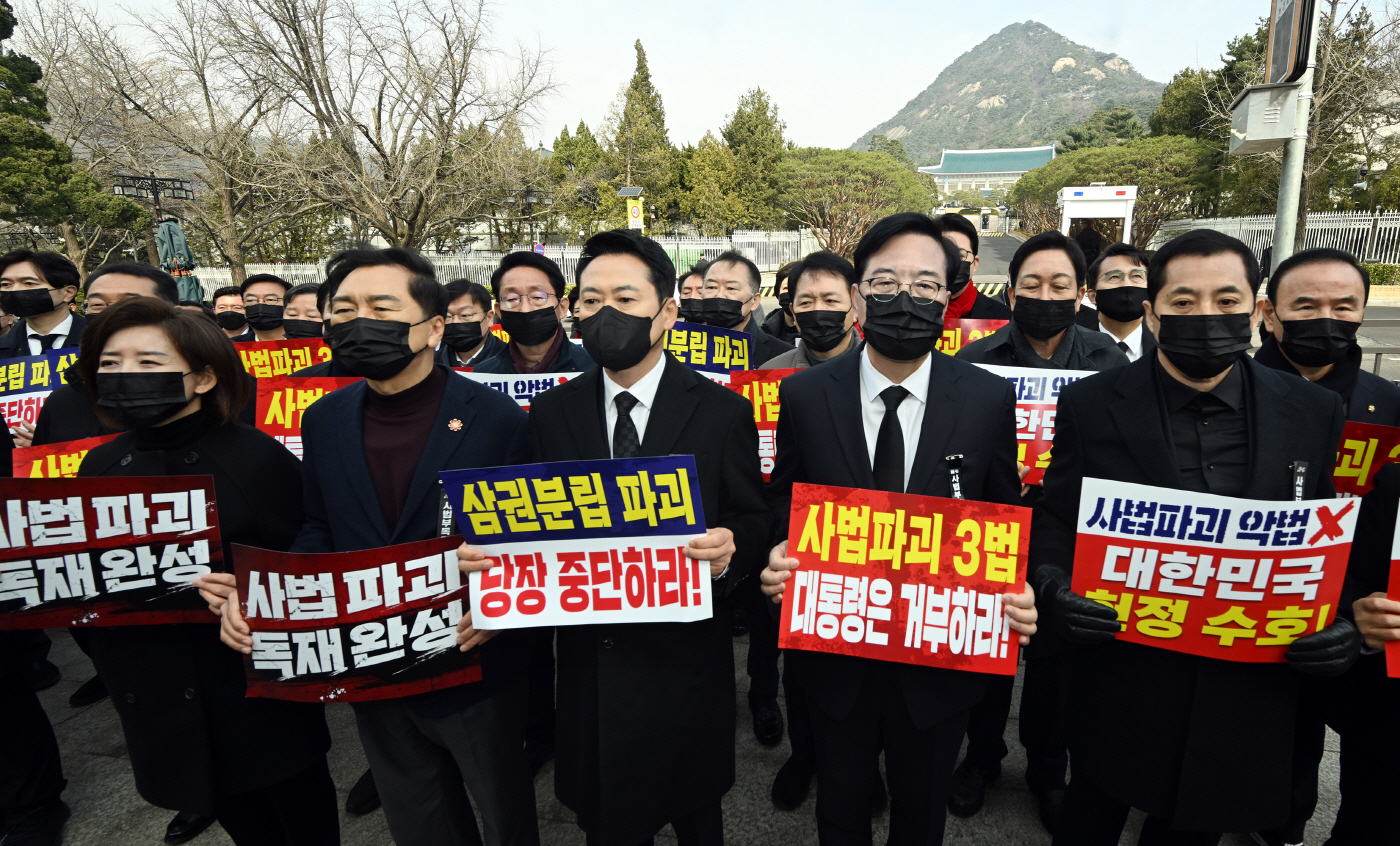 송언석 원내대표도 "거부권을 행사하지 않는다면 대통령 스스로 큰 죄인이 될 것"이라며 "공포되면 '헌법 파괴'의 판도라 상자를 여는 것"이라고 말했다.
