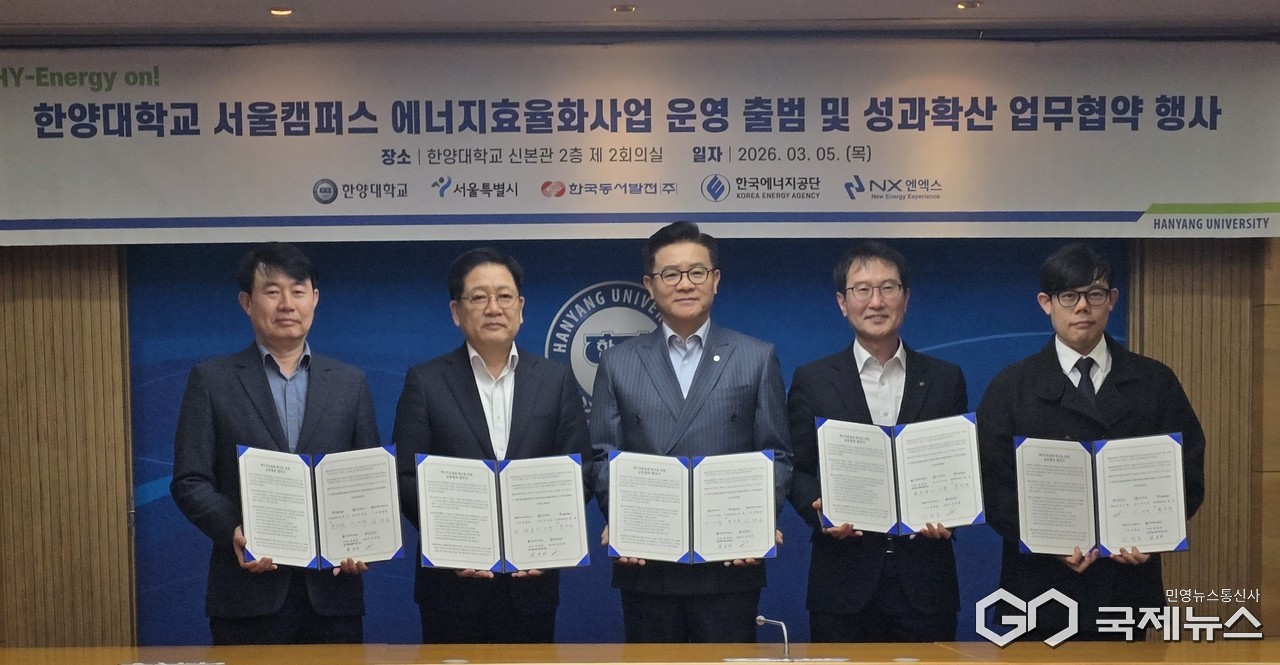 (울산=국제뉴스) 주영곤 기자 = 한국동서발전(주)(사장 권명호)는 5일 한양대학교 서울캠퍼스에서 'HY-Energy On! 한양대학교 서울캠퍼스 에너지효율화 운영 출범 및 성과확산 업무협약식'을 열었다고 밝혔다.