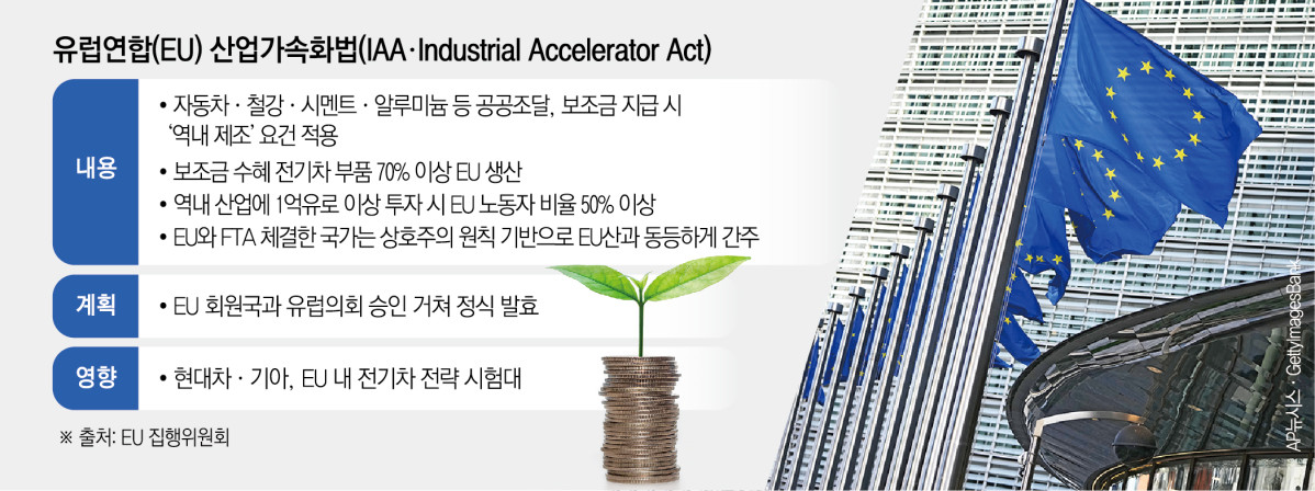 유럽연합(EU)이 ‘메이드 인 유럽(Made in Europe)’ 전략을 담은 산업 가속화법(IAA·Industrial Accelerator Act)을 추진하면서 현대자동차·기아의 유럽 전기차 전략이 시험대에 올랐다. 자유무역협정(FTA) 체결국에는 예외가 적용되지만, 전기차 보조금 지급 요건에 역내 조립과 부품 기준이 포함되면서 완성차 업계의 긴장감이 높아지고 있다.
