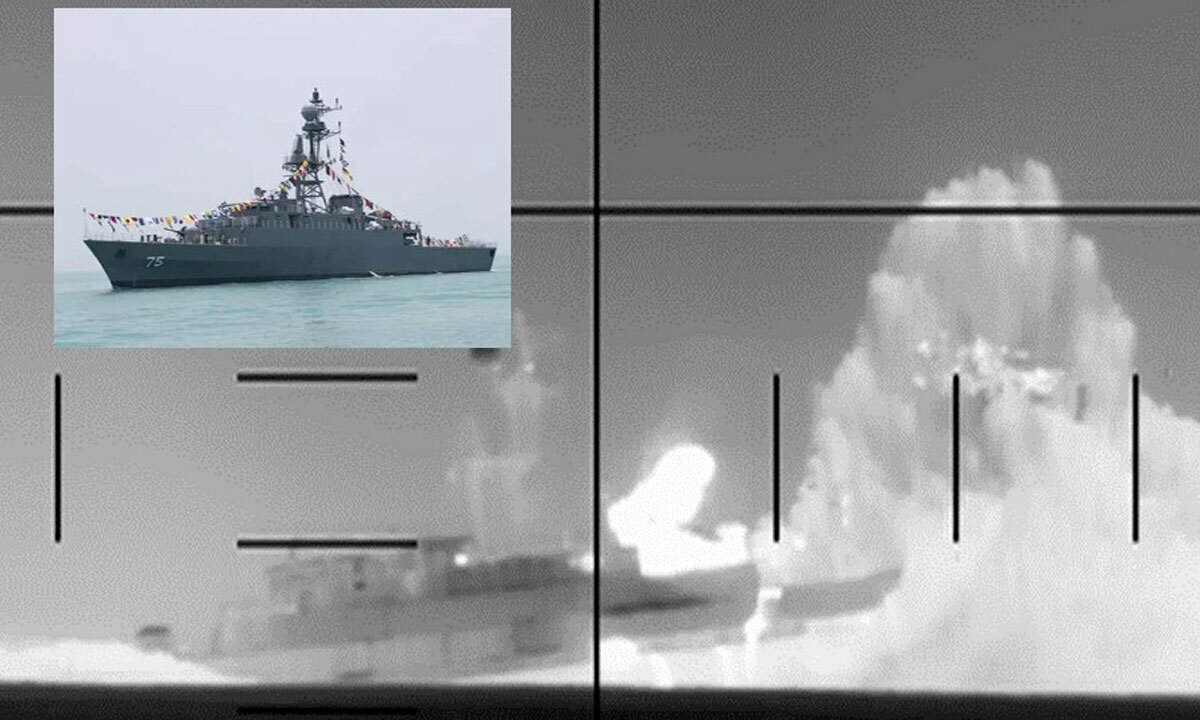 美, 어뢰로 이란 군함 공격… 2차대전 이후 처음 4일(현지시간) 스리랑카 인근 인도양에서 미 해군 잠수함의 어뢰 공격을 받은 이란 해군의 최신 호위함 ‘아이리스 데나’호에서 불길과 물기둥이 솟구치고 있다. 작은 사진은 침몰 약 2주 전인 지난달 18일 인도 비사카파트남에서 열린 국제 함대 사열식에 참여한 아이리스 데나호의 모습. 미 국방부 제공, AP연합뉴스 |