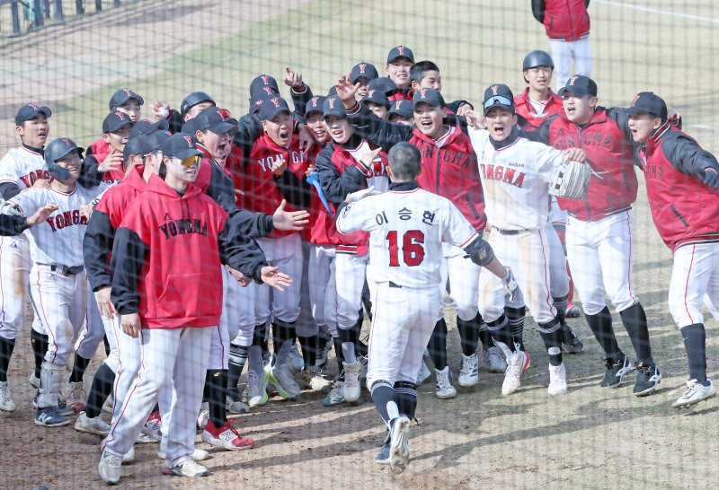롯데자이언츠와 파이낸셜뉴스, 부산파이낸셜뉴스, 부산광역시소프트볼협회가 공동 주최한 '2026 명문고 야구열전' 마지막 날인 5일 부산 기장현대차드림볼파크에서 열린 마산고-마산용마고의 결승전에서 마산용마고 이승현 선수가 5회 2점 홈런을 치고 동료들의 축하를 받고 있다. 사진=박범준 기자 |