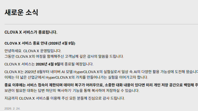 네이버가 대화형 AI 서비스 ‘클로바X’를 다음 달 9일 종료한다고 공지했습니다. 2023년 8월 베타 버전으로 선보인 지 2년 8개월 만입니다.