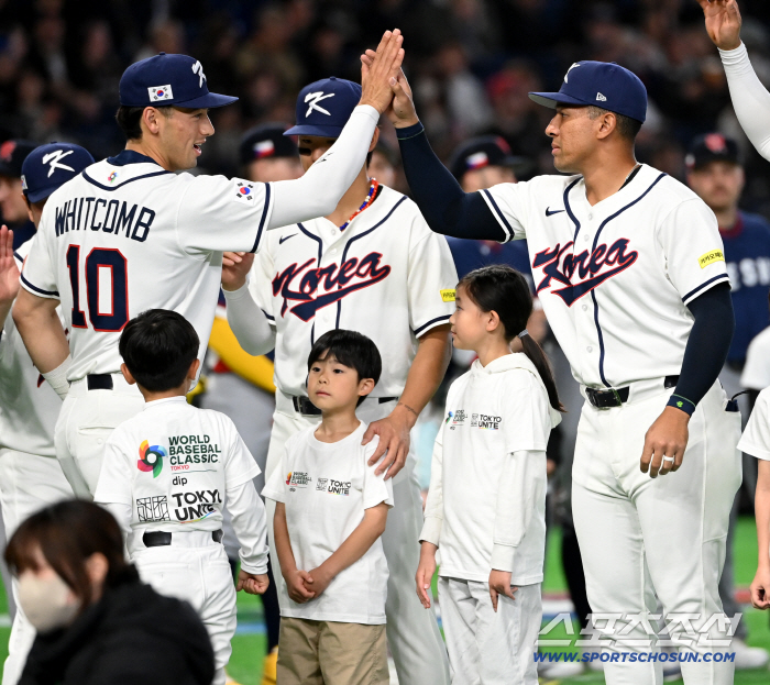 5일 일본 도쿄돔에서 열린 WBC(월드베이스볼클래식) 한국과 체코의 경기. 선수 소개때 셰이 위트컴과 자마이 존스가 하이파이브를 하고 있다. 도쿄(일본)=허상욱 기자wook@sportschosun.com/2026.03.05/