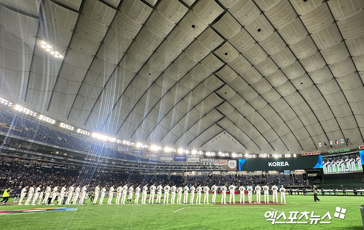 (엑스포츠뉴스 도쿄(일본), 김한준 기자) 5일 오후 일본 도쿄돔에서 열리는 2026 월드베이스볼클래식(WBC) C조 체코와 대한민국의 경기, 경기 전 한국 대표팀이 국민의례를 하고 있다.
