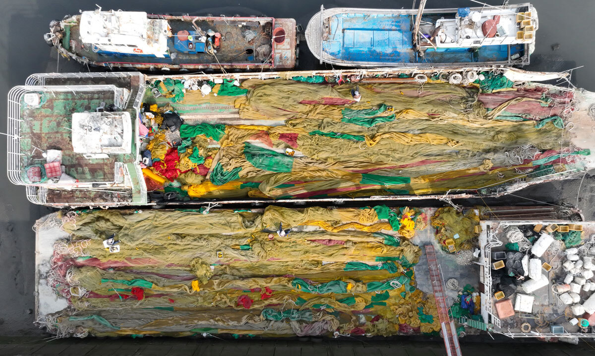 5일 인천 중구에서 드론을 띄워 하늘에서 내려다본 북성포구 모습. 본격적인 꽃게, 숭어 등 출어기를 앞두고 그물 손질에 여념이 없는 어민들 모습이 형형색색의 유채화 같은 느낌을 준다.