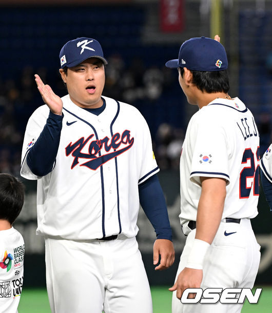 경기에 앞서 한국 류현진이 이정후와 하이파이브를 하고 있다. 2026.03.05/spjj@osen.co.kr