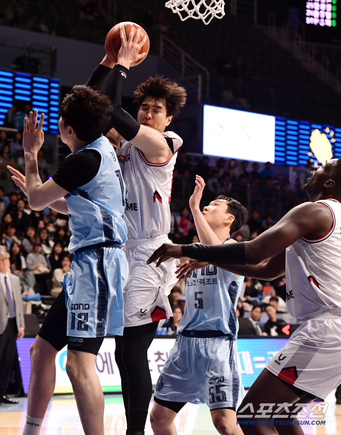 5일 고양 소노아레나에서 열린 프로농구 고양 소노와 안양 정관장의 경기. 공격 리바운드를 잡아내고 있는 안양 김종규. 고양=송정헌 기자songs@sportschosun.com/2026.03.05/
