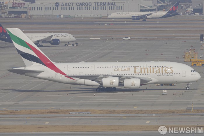 [영종도=뉴스핌] 류기찬 기자 = 미국의 이란 공습으로 중동 지역의 군사적 긴장이 고조되고 있는 가운데 4일 오후 인천국제공항 주기장에 이날 결항된 두바이행 에미레이트 항공 A380-861이 주기되어 있다. 2026.03.04 ryuchan0925@newspim.com |