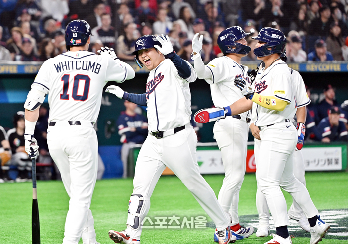 대한민국 야구대표팀의 문보경(가운데)이 5일 일본 도쿄 도쿄돔에서 열린 2026 월드 베이스볼 클래식(WBC) 조별리그 체코와의 경기 1회말 1사 만루 상황에서 체코 선발 파디샤크를 상대로 홈런을 친 뒤 선행 주자들과 하이파이브를 나누며 기뻐하고 있다. 2026. 3. 5.