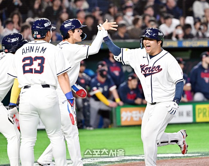 대한민국 야구대표팀의 문보경이 5일 일본 도쿄 도쿄돔에서 열린 2026 월드 베이스볼 클래식(WBC) 조별리그 체코와의 경기 1회말 1사 만루 상황에서 체코 선발 파디샤크를 상대로 홈런을 친 뒤 선행 주자들과 하이파이브를 나누며 기뻐하고 있다. 2026. 3. 5.