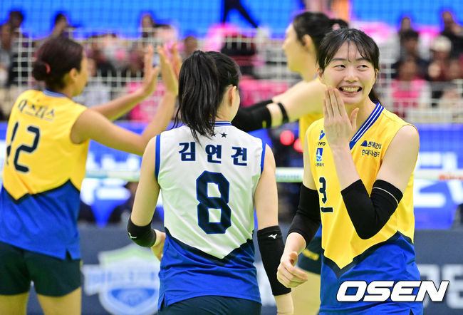 1세트 현대건설 김다인이 서브 에이스에 기뻐하고 있다. 2026.03.05 /jpnews@osen.co.kr