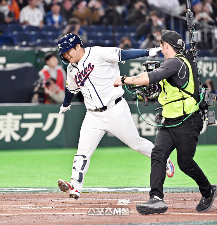 대한민국 야구대표팀의 문보경이 5일 일본 도쿄 도쿄돔에서 열린 2026 월드 베이스볼 클래식(WBC) 조별리그 체코와의 경기 1회말 1사 만루 상황에서 체코 선발 파디샤크를 상대로 홈런을 친 뒤 ‘마이애미행 전세기’ 세리머니를 하며 홈플레이트를 밟고 있다. 2026. 3. 5.