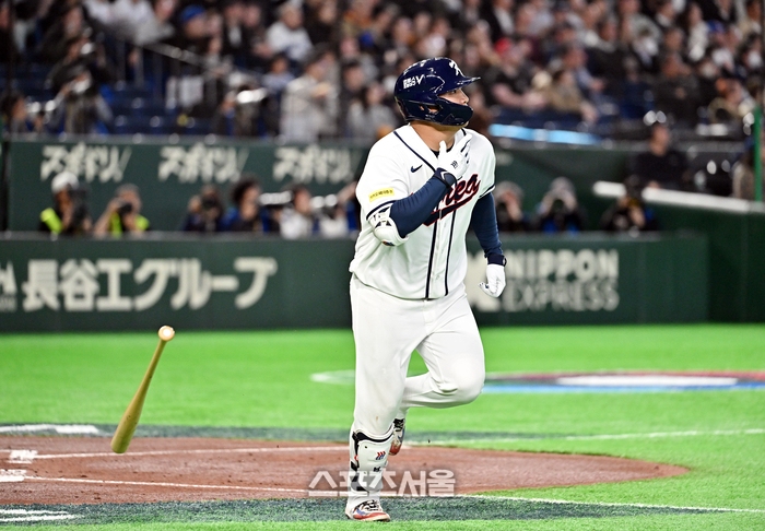 대한민국 야구대표팀의 문보경이 5일 일본 도쿄 도쿄돔에서 열린 2026 월드 베이스볼 클래식(WBC) 조별리그 체코와의 경기 1회말 1사 만루 상황에서 체코 선발 파디샤크를 상대로 홈런을 치고 있다. 2026. 3. 5.
