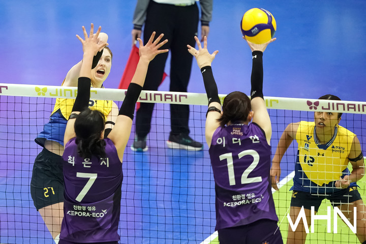(MHN 수원, 박태성 기자) 5일 수원실내체육관에서 '진에어 2025~2026 V-리그' 여자부 현대건설(2위 61점 32경기 21승 11패)과 흥국생명(3위 53점 33경기 17승 16패) 경기가 열렸다.