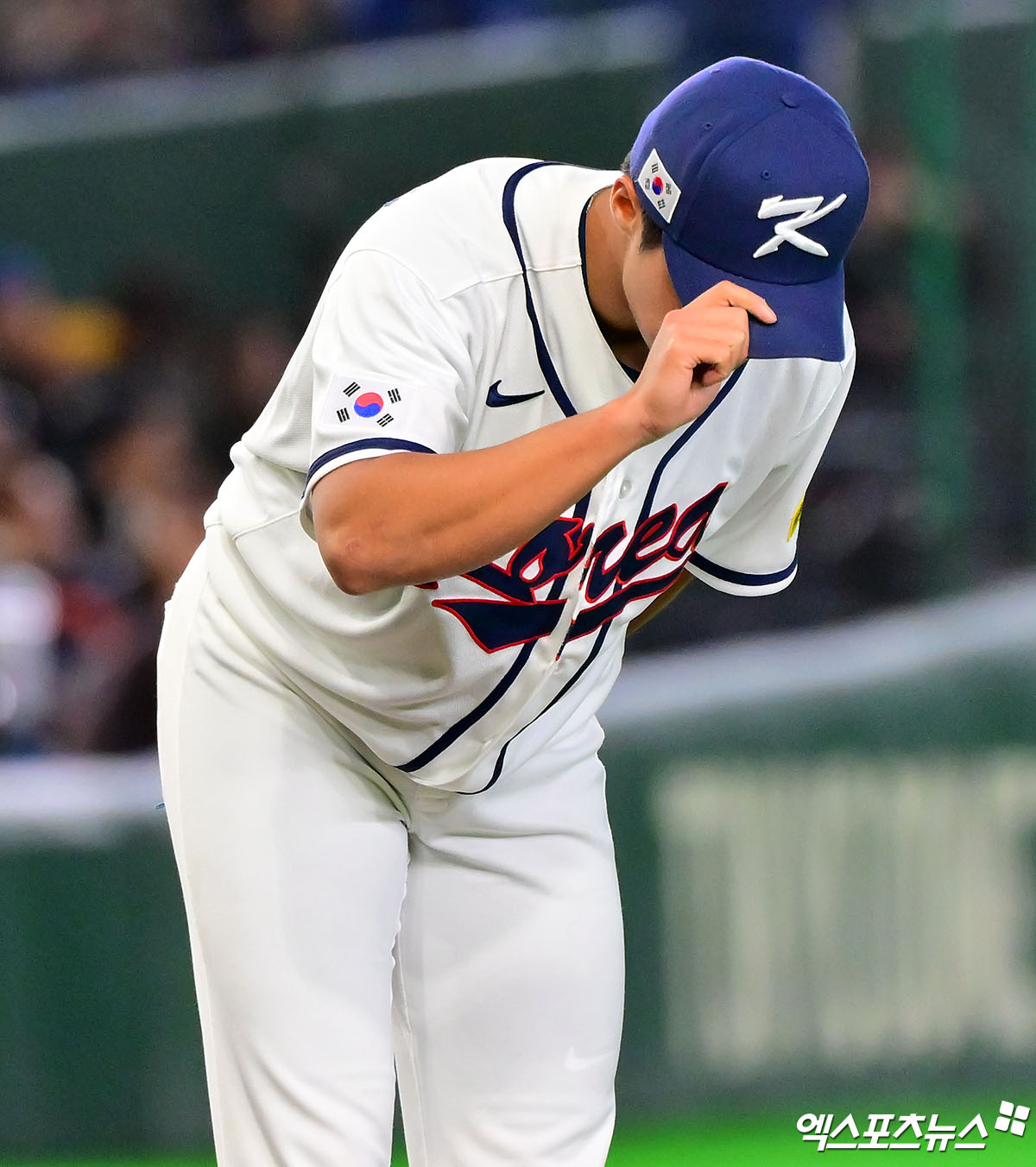 (엑스포츠뉴스 도쿄(일본), 김한준 기자) 5일 오후 일본 도쿄돔에서 열린 2026 월드베이스볼클래식(WBC) C조 체코와 대한민국의 경기, 5회초 한국 정우주가 체코 프레아다에게 사구를 허용한 후 사과 인사를 하고 있다.