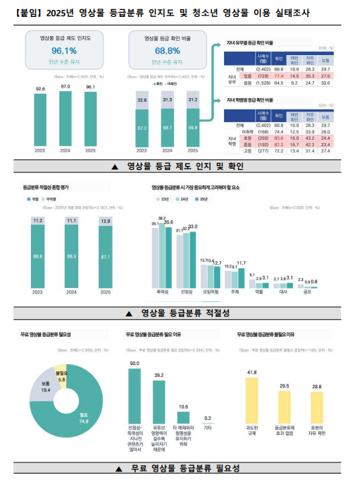 영상물등급위원회(이하 영등위, 위원장 김병재)는 5일, 2025년 실시한 '영상물 등급분류 인지도 및 청소년 영상물 이용 실태조사' 결과를 발표하며 미디어 환경 변화에 따른 제도 개선 방향을 제시했습니다.