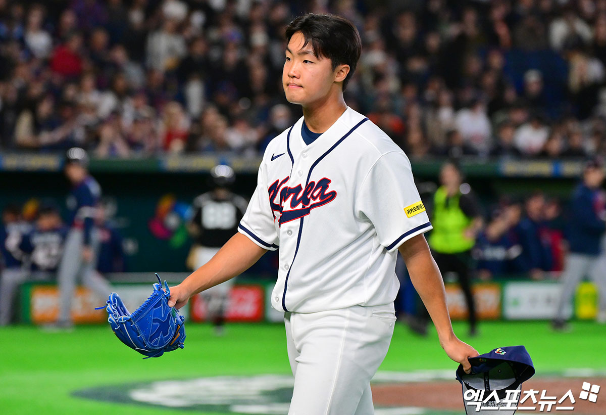 (엑스포츠뉴스 도쿄(일본), 김한준 기자) 5일 오후 일본 도쿄돔에서 열린 2026 월드베이스볼클래식(WBC) C조 체코와 한국의 경기, 5회초 수비를 마친 한국 정우주가 더그아웃으로 향하고 있다.
