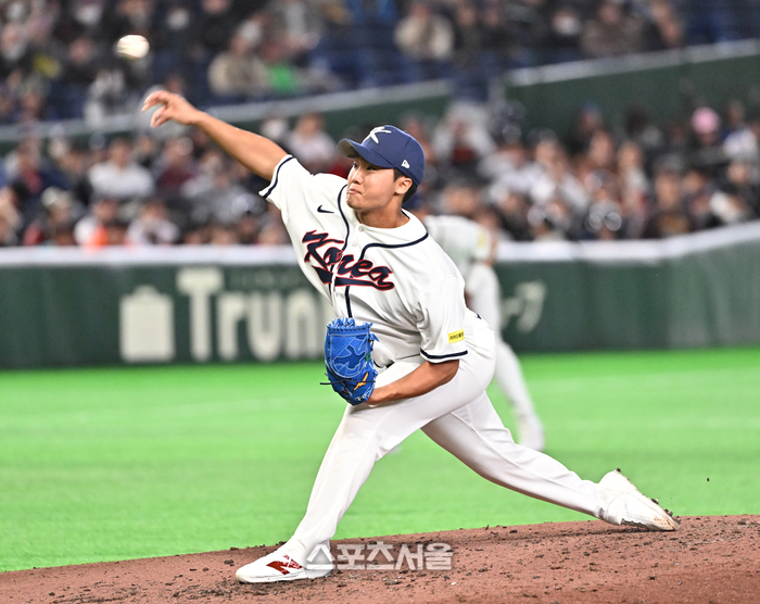 대한민국 야구대표팀의 정우주가 5일 일본 도쿄 도쿄돔에서 열린 2026 월드 베이스볼 클래식(WBC) 조별리그 체코와의 경기 5회초 등판해 힘차게 공을 던지고 있다. 2026. 3. 5.