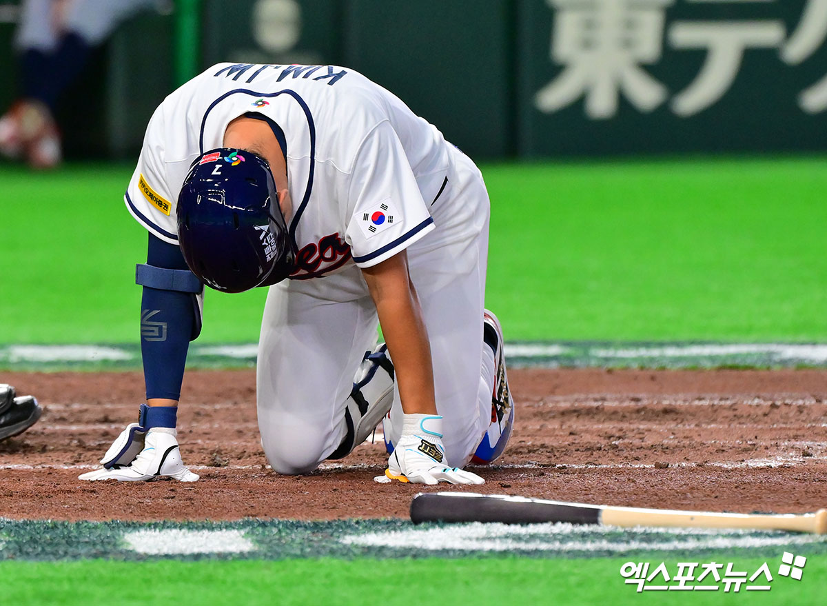 (엑스포츠뉴스 도쿄(일본), 김한준 기자) 5일 오후 일본 도쿄돔에서 열린 2026 월드베이스볼클래식(WBC) C조 체코와 한국의 경기, 5회말 2사 2루 한국 김주원이 파울타구에 맞은 후 고통스러워하고 있다.
