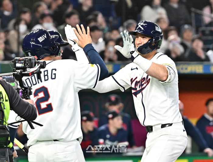 대한민국 야구대표팀의 셰이 위트컴(오른쪽)이 5일 일본 도쿄 도쿄돔에서 열린 2026 월드 베이스볼 클래식(WBC) 조별리그 체코와의 경기 5회말 1사 1루 상황에서 체코 투수 코발라를 상대로 2점 홈런을 치고 동료들과 하이파이브를 하고 있다. 3회말에 이어 위트컴의 연타석 홈런. 2026. 3. 5.