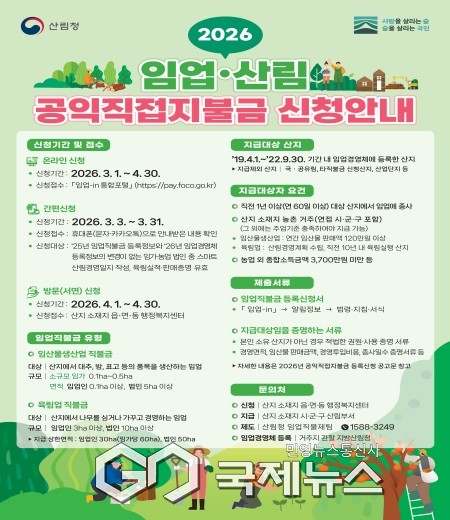 (봉화=국제뉴스) 백성호 기자 = 봉화군(군수 박현국)은 산림의 공익기능 증진과 임업인의 소득 안정을 위해 3월 4일부터 4월 30일까지 '2026년 임업·산림 공익직접지불금(이하 임업직불금)' 신청을 접수한다고 밝혔다.