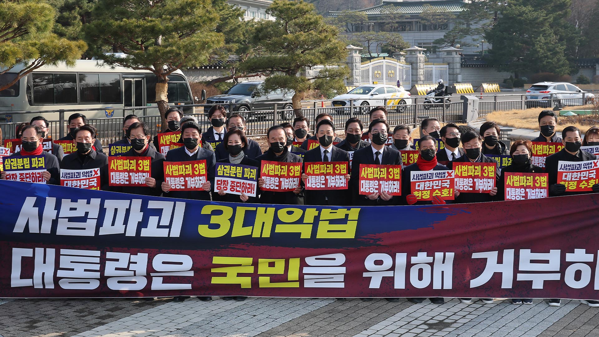 국민의힘은 이른바 '사법 3법' 국무회의 처리에 항의해 청와대 앞에서 '상복 의총'을 열었습니다.