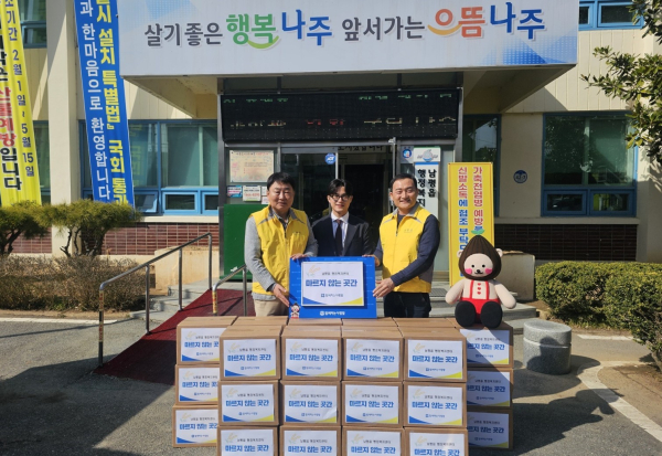 (사)함께하는 사랑밭 김형진 지부장(가운데)은 지난 4일 나주시 남평읍지역사회보장협의체 오시근 남평읍장(오른쪽)과 구동주 민간위원장(왼쪽)에게 후원품을 기탁했다. [사진=전라남도 나주시] |