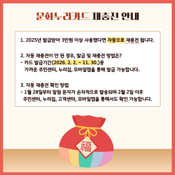 또한, 자동재충전 대상은 문화누리카드 발급자 중 2026년에도 수급 자격을 유지하면서 2025년 카드 사용금액이 3만 원 이상인 경우, 별도 신청 없이 지원금이 자동으로 충전되며, 자동재충전 대상에서 제외되었더라도 수급 자격이 유지되는 경우에는 읍·면사무소 또는 문화누리카드 누리집을 통해 별도로 신청할 수 있습니다.