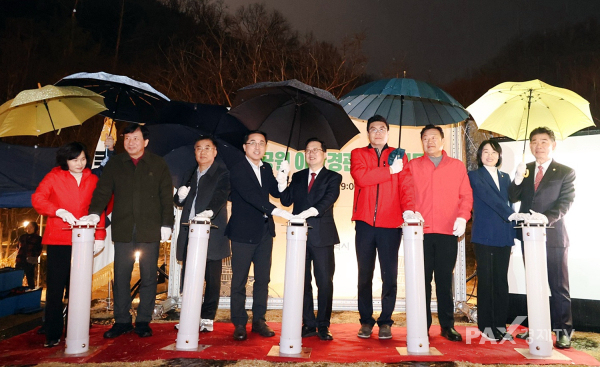 대전시는 5일 오후 7시 동구 가양동 우암사적공원 일원에서 우암사적공원 야간경관조명 점등식을 열었다고 밝혔다. 사진은 이장우 대전시장(가운데)이 참석자들과 야간경관조명 점등식을 하고 있다. [사진제공=대전시][대전=팍스경제TV] 대전의 대표적 역사문화 공간인 우암사적공원이 은은한 조명과 함께 밤의 문을 활짝 엽니다.