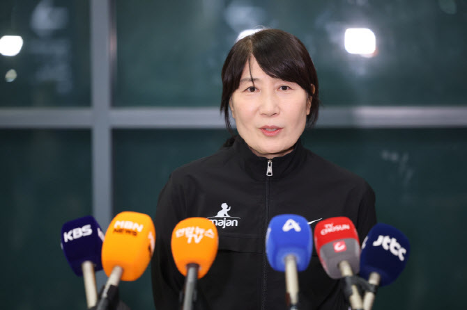 이도희 이란 여자배구 국가대표팀 감독이 5일 인천국제공항 제1여객터미널을 통해 귀국하며 입장을 밝히고 있다. 사진=연합뉴스