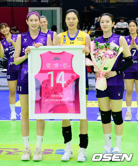 경기를 마치고 흥국생명 김수지, 이다현이 지난 3일 은퇴를 선언한 현대건설 양효진에게 유니폼을 전달하며 기념 촬영을 하고 있다. 2026.03.05 /jpnews@osen.co.kr