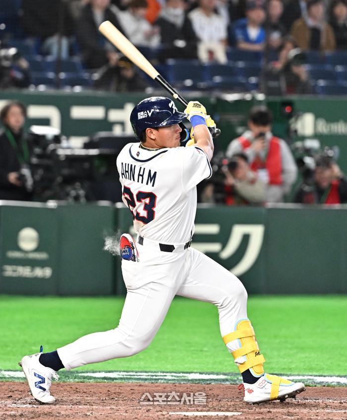 대한민국 야구대표팀의 안현민이 5일 일본 도쿄 도쿄돔에서 열린 2026 월드 베이스볼 클래식(WBC) 조별리그 체코와의 경기 7회말 무사 안타를 치고 있다. 2026. 3. 5.