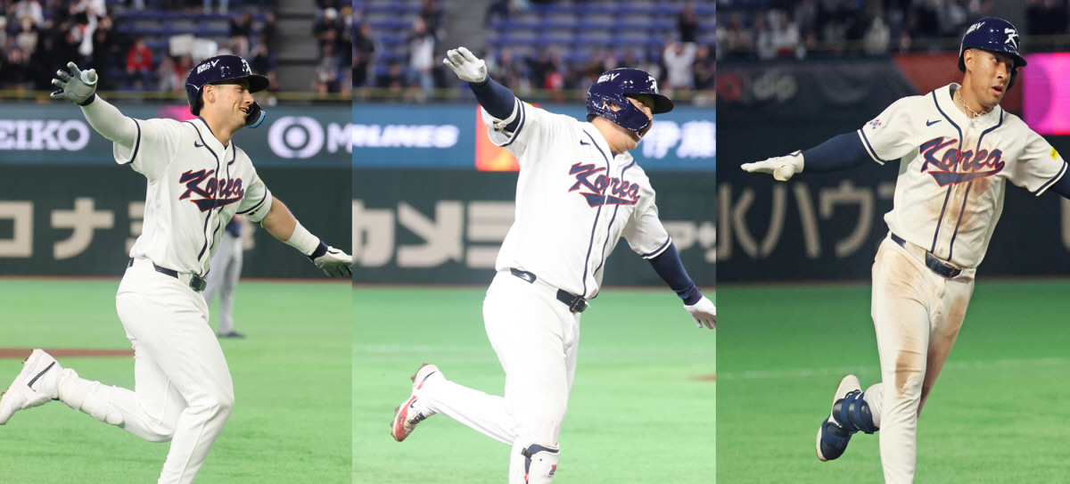 마이애미 향해 날자꾸나 한국 야구 대표팀 셰이 위트컴, 문보경, 저마이 존스(왼쪽부터)가 5일 일본 도쿄돔에서 열린 2026 월드베이스볼클래식(WBC) 조별리그 C조 1차전 체코전에서 각각 홈런을 치고 비행기 세리머니를 펼치고 있다. 도쿄 | 연합뉴스 |