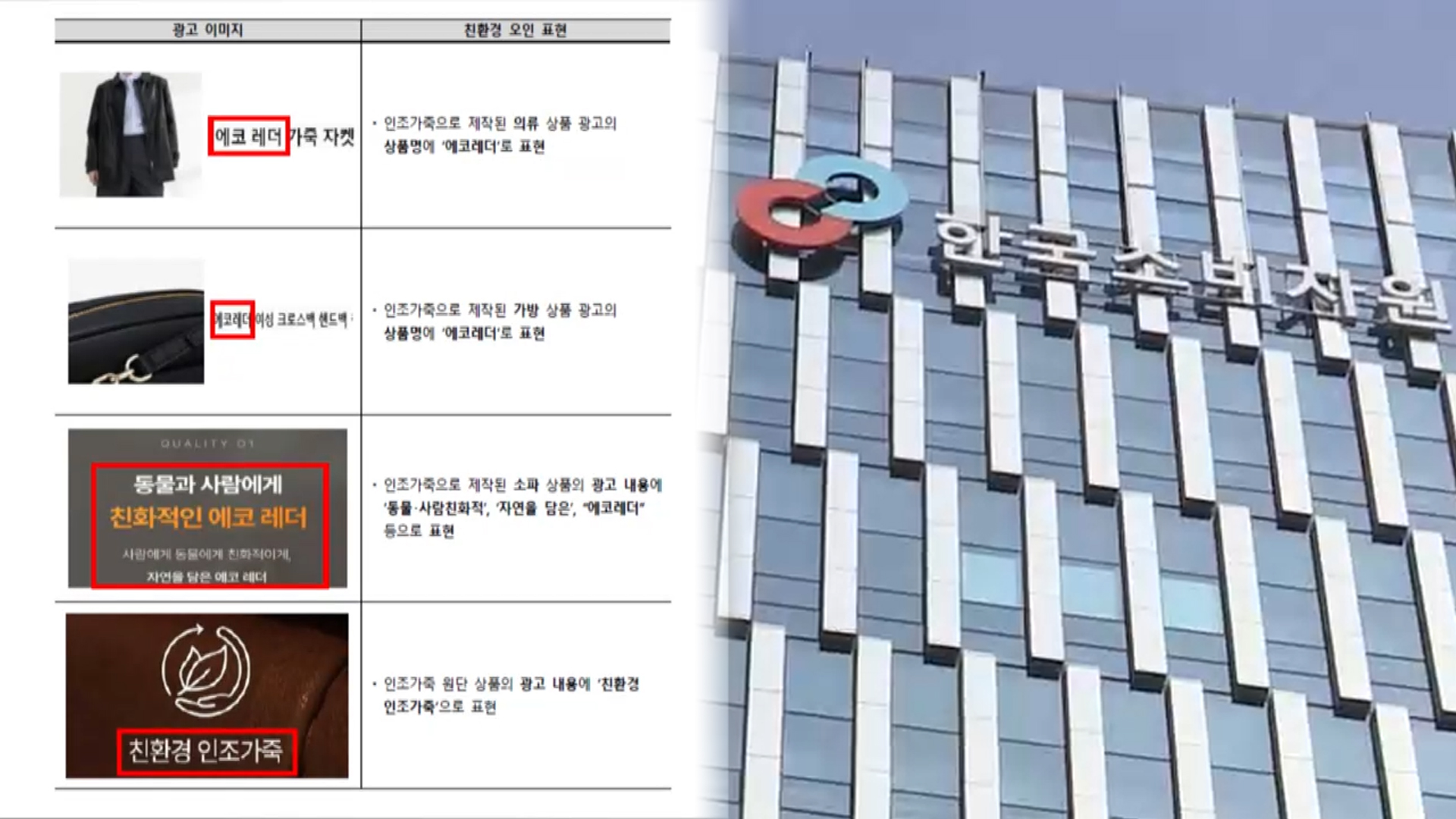 적발된 사업자들은 인조가죽 제품 생산 시 동물을 죽이지 않는다는 이유로 '에코레더'와 같은 친환경적 표현을 사용해 광고했습니다.