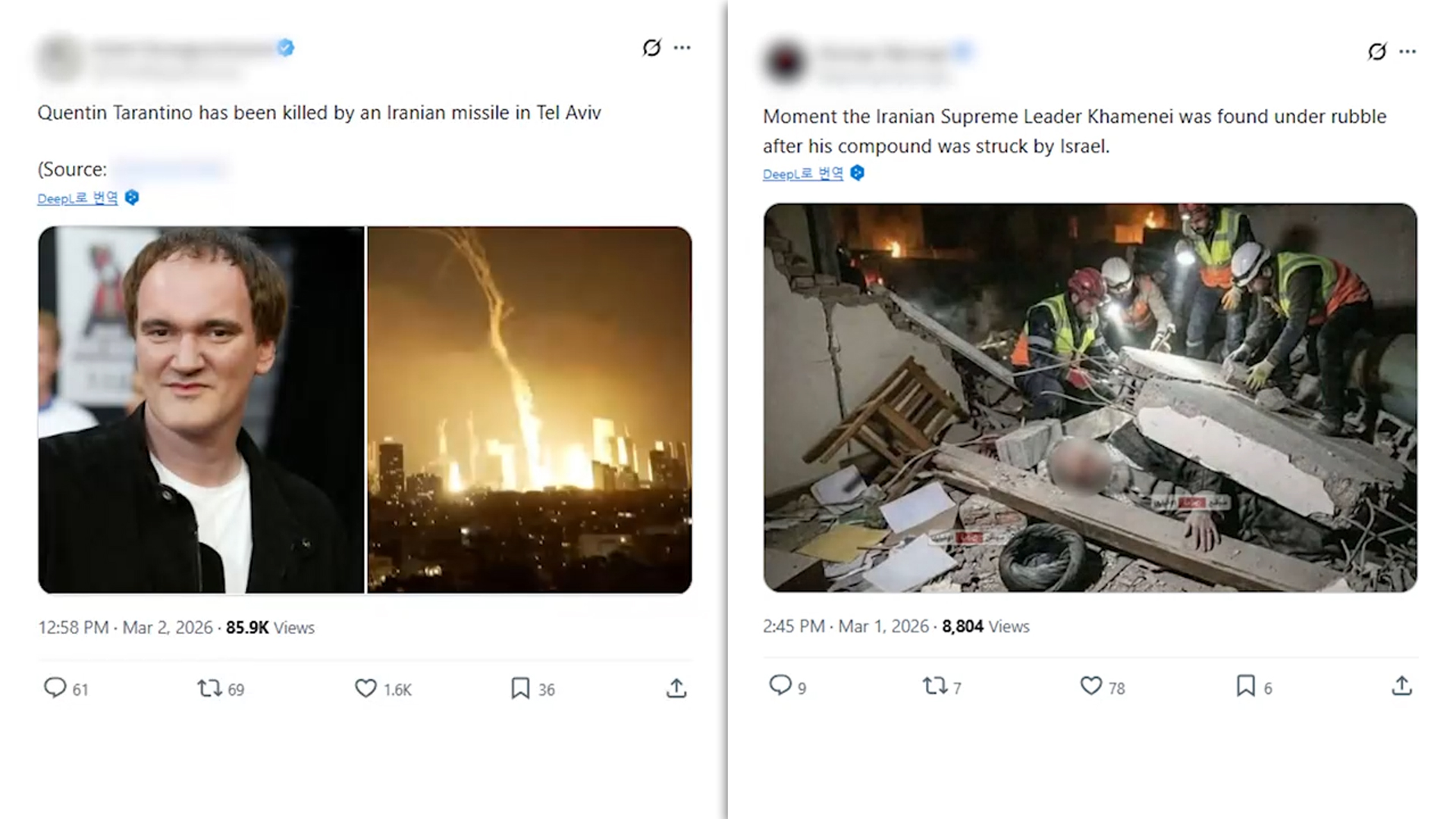 유명 영화감독 쿠엔틴 타란티노가 이스라엘에서 미사일 공격으로 사망했다는 허위 글이 확산했지만, 사실이 아닌 것으로 드러났습니다.