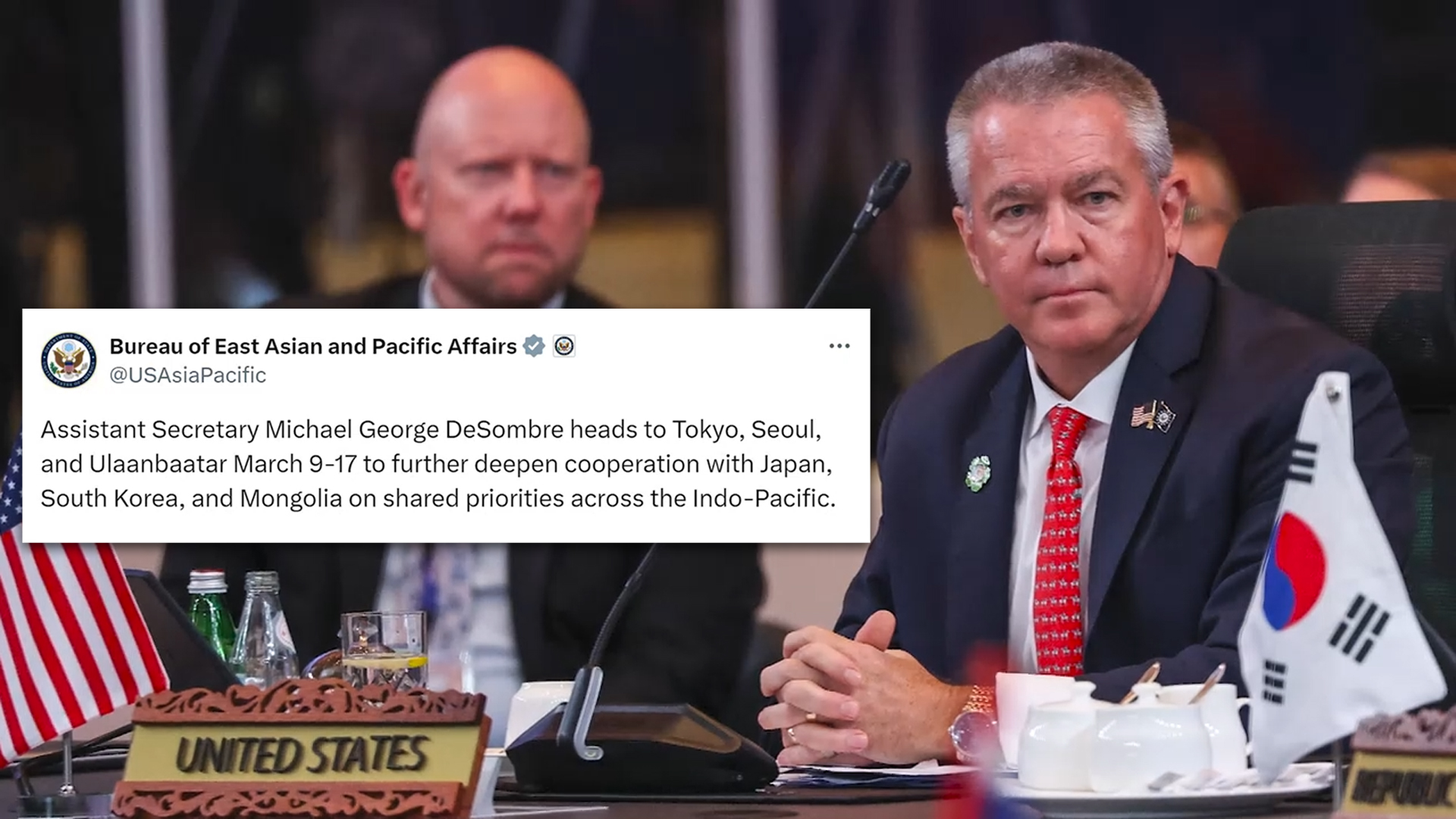 미 국무부 동아시아·태평양국은 현지 시간 5일 소셜미디어를 통해 "드솜브레 차관보가 오는 9일부터 17일까지 한국과 일본, 몽골을 방문해 각 국가와의 협력을 심화할 예정"이라고 밝혔습니다.
