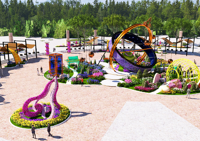 또한 높이 13m, 폭 26m 규모의 대형 랜드마크 구조물은 회전하는 구형 꽃조형물(키네틱 요소)을 통해 시간의 흐름을 상징적으로 표현, 관람객들에게 압도적인 경험을 제공한다.