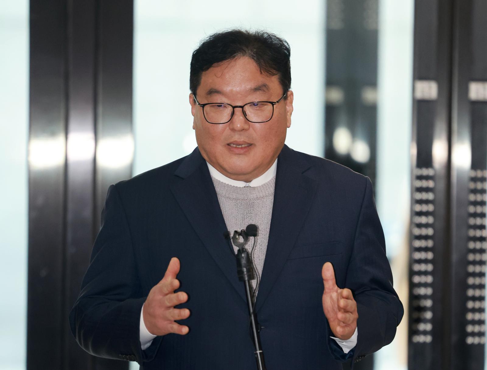 쿠팡 퇴직금 미지급 사건과 관련해 직권남용 권리행사 방해 및 국회에서의 증언·감정 등에 관한 법률 위반 혐의로 기소된 엄희준 검사가 지난달 27일 서울 서초구 안권섭 쿠팡·관봉권 상설특별검사팀 사무실 1층에서 기자회견을 갖고 있다. 2026.2.27 뉴스1 |