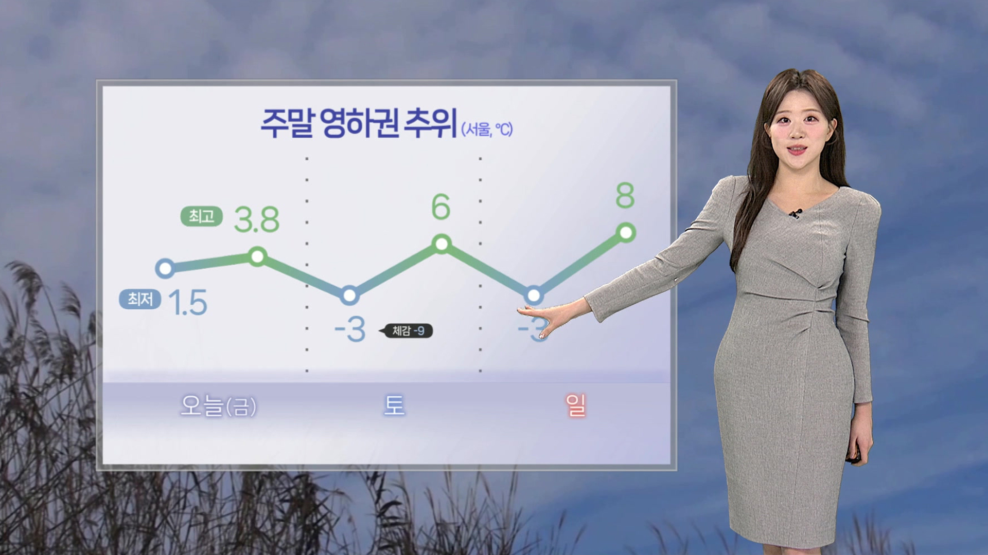 주말인 내일 서울의 아침 기온이 영하 3도로 떨어지겠고, 찬 바람 속 체감 추위는 영하 9도로 곤두박질하겠습니다.
